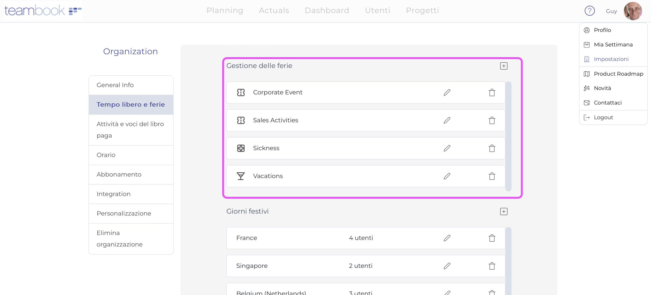 Teambook include i giorni festivi del vostro Paese per impostazione predefinita. Per i membri del team che risiedono in altri Paesi o regioni, regolate le festività utilizzando le funzioni di automazione di Teambook.