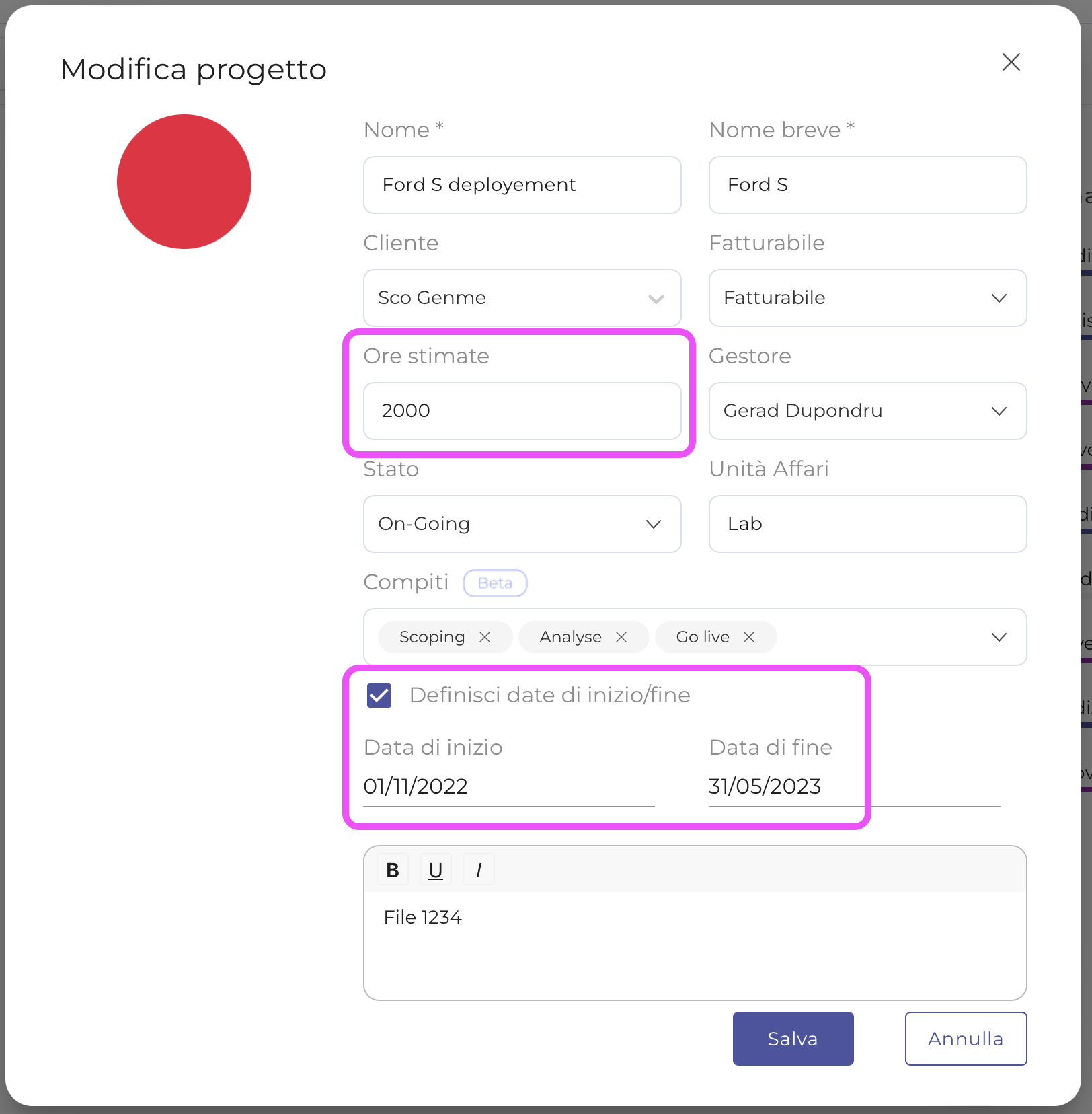 Alla fine del periodo, è fondamentale che i membri del team inseriscano il tempo effettivo trascorso sui progetti. Queste informazioni integrano la barra di avanzamento iniziale. Questo aggiornamento permette di fare un confronto diretto tra il tempo pianificato e quello effettivamente impiegato nel progetto, fornendo una visione chiara dei progressi effettivi rispetto alle previsioni.